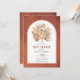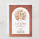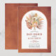 Tropiska torkade palmlöven, pampasgräs och proteablommor terrakotta båge baby shower inbjudan. Denna vackra design har en båge ram på terrakotta färgad bakgrund. I ramen finns en akvarellbukett av torkade palmlöven, proteablommor och pampasgräs.