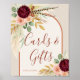 Välkommen gästerna till kort- och presentbordet med detta eleganta bröllopsduschskylt med hösttema. Skylten pryds av en akvarellbouquet med djup burgunderfärgade krysantemum, mjuka rosa rosor, gyllene höstlöv, torkad pampasgräs, salvia grön eukalyptus och rustika västerländska fasanfjädrar, allt mot en modern bohemisk terrakotta-rust orange båge och jordnära ler beige bakgrund, vilket ger din fest en säsongsbetonad charm. Anpassa texten med brudens namn eller instruktioner. Passar perfekt med matchande inbjudningar, presentkort och bordssmyckning i hösttemat från Porch And Gable Design.