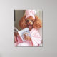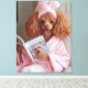 En mycket realistisk bild av en charmerande pudel-relaxering i en rosa badbe med en motsvarande handduk inlindad runt huvudet. Den berömvärda hund är bekvämt sitta på en stol och håller en tidskrift med ett annat pudel på omslaget. Dess lekfulla uttryck och lyxaktiga spa-liknande inställning gör den här scenen både söt och underhållande.