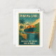 Retro-stil resaffisch för Panamakanalen, med ett stort lastfartyg som passerar genom kanalens slussportar, med tropiska palmer och frodiga gröna kullar i bakgrunden. En ljus himmel med flygande fåglar betonar frihet och handel mellan Atlanten och Stilla havet.