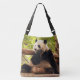 Cute panda som äter bambu skjuter för snack. sitta under en träd för skugga.