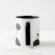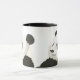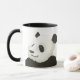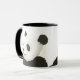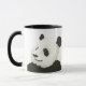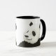 Cute mugg med två pandor runt bildområdet. Bakgrunden är vit och kopp är svart inuti, med ett svart handtag. Pandan är målad.