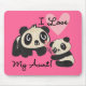 Två pandabjörnar, ett litet och en vuxen, en rosa hjärta, rosa blommor och text, som läser mig, älskar min moster på pandabjörnT-tröja, hänger lös, rånar, knäppas, kort och andra objekt.