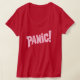 Typografiska slogan t-shirt i ljus rosa text. Läser: Panic! Ideal skapade från panik! Text designad av Sarah Trett.