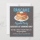 Tvåsidigt födelsedagsinbjudan till pannkaks- och pyjamasfest.