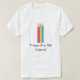 Basic T-Shirt with pencils in the colors of pansexuality rainbow flag of pink, yellow and blue; pan pride lgbtqiap+ design, "These Are My Colors" template text, by pinkbrickroad