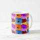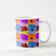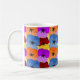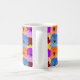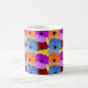 Mugg har en Vår-design av lila, blått, orange och rött med rutor för gult som är lagrade på varandra på en fält av gulten.