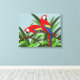 Fågelkonst på canvas med två scharlakansaraor som sitter på en gren med en grön lövbakgrund.