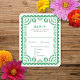 Svarskortet på den vackra gröntens bröllopsinbjudan inspireras av mexikanska bröllop-banderoller som kallas papel picado. De är perfekt för ett latinx-destinationsbröllop mellan firande eller Mexiko. Se den samordnande samlingen bröllop ovan..