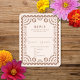 Svarskortet på bröllopsinbjudan inspireras av mexikanska bröllop-banderoller som kallas papel picado. De är perfekt för ett latinx-destinationsbröllop mellan firande eller Mexiko. Se den samordnande samlingen bröllop ovan..