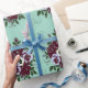 Sublimer vos paquets avec ce papier cadeau haut de gamme au motif floral raffiné. Le design présente une répétition élégante de votre bouquet signature composé de roses bordeaux et de pensées lilas sur un fond vert d'eau apaisant. Idéal pour des cadeaux de mariage, d'anniversaire ou toute occasion spéciale.