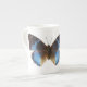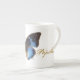 En vacker shabby chic-bild av en blå fjäril, på en blå bakgrund med vintage fransk-skript. ©Wickedlyunderbar