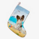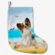 Söt hund som sitter på stranden är en perfekt presentidé för någon som älskar denna hundras.