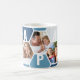 Honeycomb-kaffe mugg, personlig med 5 av dina favoritfoton och utskrift med 4 brev namn, t.ex. PAPPA. Utformningen har en honeycomb-fotokollage i en färg-palett med blått och grått, med ett sött litet bi. Om du vill ändra färg klickar du på "anpassa ytterligare" och klickar på varje hexagon som du vill ändra.