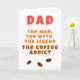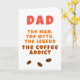 Pappa Man Myte Legend Koffeberoende Roligt Fars Dag Kort. Roligt fars dag kort med humoristisk citat 'Pappa, mannen, myten, legenden, koffeberoende' och kaffebönor. Texten är i modern fet typografi i vintagefärger. Du kan ändra valfri text på kortet.