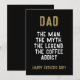 Pappa Man Mytt Legend Koffeberoende Rolig Farsdagskort. Roligt farsdagskort med humoristisk citat ' Pappa, mannen, myten, legenden, koffeberoende '. Texten är i modern fet typografi. Du kan ändra valfri text på kortet.