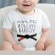 Design med citatet "Pappas lilla rullande kompis" med ett jiu-jitsu-bälte. Det ser bra ut för en graviditetsannonsering eller bebisannonsering.