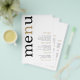 PAPPER Simple Black Guld Typography White Bröllop Menu. Ett PAPPERT alternativ med underbart värde (inte kort) i storleka 5,5 x 8,5 tum. En modern typografisk design med Menu i stor typografi i svart med "n" i guld roterat och till lämnat sida på vit bakgrund.