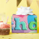 Färgfulla ballonger över en färgstark övertoningsbakgrund med Grattis på födelsedagen i regnbågstext.