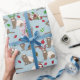 Kute juliller i tomten med polkagrisar och sträng ljus på blå bakgrund med utspridda prydnadsföremål som är pappra.
