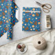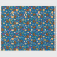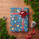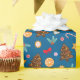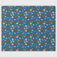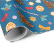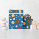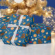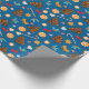 Papper med ett nyår med mönster, söt bilder av maträtter, lippor och kakor, bröd och löv på blå bakgrund.