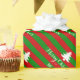 Personlig namn och hälsning God jul träd som slår pappert. Röd och grönt strimlade mönster-julen med papper skal av Cute rand-formade presenter för Julafton Helgdag presenter-Helgdag-klackskräppost med diagonalt linjer. Anpassadets bakgrund färg. Elegantens skripttypografi.