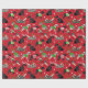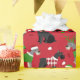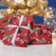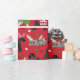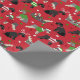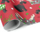 Kute julschnauzers med salt och peppar och svart och silver jackar bära jultomater, antrar och portilsvettare på röd bakgrund med utspridda prydnadsföremål.