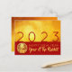 Modern design med gyllene texturerad papper (utskriven bild) med stor 2023 i rött + liten, papper tiger-klippning med gult text GOTT NYTT ÅR och kaninår mot röd bakgrund. Utforma vykort för vågräts helgdag med gyllene bakgrunder. Matchande hälsningskort och fyrkantig inbjudan med texter som du kan anpassa till för New year firande. Perfekt för ett tidlöst och modernt kinesiskt nyår för kanin 2023.