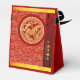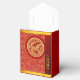 En elegant av en gyllene häst med blommar i en cirkel (inspirerad av traditionell kinesisk papper klippning) med röd cirkel täcker över en röd och gult traditionell asiatisk mönster + grafisk "GOTT NYTT ÅR" på kinesiska och engelska och gammal kinesisk kalligrafi för "häst" på högerna på gradiant red färg. Utformning på party pappra tält-förmånslådan. Matchande gratulationskort, vykort för helgdag, platta kvadratiska kort, runda platta kort, platta kort för lodrät och mer snart.