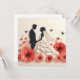 Fin illustration av ett par i bröllop med en bakgrund av röda poppies och svarta fjärilar. Paret är i silhuett, med brudgummen i kostym och bruden i en blomklänning med slöja. Det övergripande färg-systemet är rött, svart och vitt.