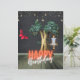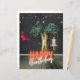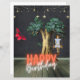 En magiskt surrealistisk födelsedag med vintage stjärngarland och brunettflicka i svängklippor...den överdimensionerade rödfjärilen, den gyllene bottennoten träd och texten "Grattis på födelsedagen" på lax och vit neon.
