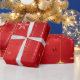 Backa din gåva i detta vackra, chili-röda färg med gyllene ornament, snöflingor och läskigt band.