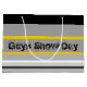 Snyggt modern papper presentväska med handtag med rand-utskrift. Kolets grått, gult och vit bakgrund kan växlas till valfritt färg för att matcha din händelse. Logotyp kan läggas till för att anpassa ännu mer. Text kan vara personlig eller text kan tas bort.