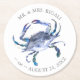 Kustnära bröllop-underlägg var designade genom att använda en kopia av min ursprungliga vattenkrabba i havets blå nyans. Anpassa med ditt namn och bröllop-datum. Besök www.zazzle.com/dotellabelle för att se fler tropisk kursbröllopsfavörer och party-dekanter.