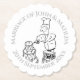 Roligt underlägg för bröllopsfest eller utomhusmottagning. En lustig tecknad som jag illustrerar är att en gigantisk bröllop-kaka har frambringats av en kock som är en stepladder, och en ordalydelse som omfattar namn av bruden och brudgummen samt bröllop.