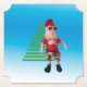Tomten tar sin fritid framför en stiliserad grönt Julgran. Trötta i solglasögon, rödhatt, röd skjorta med fisk på den, kort och svarta skor i flera färgader, tomten är redo att slappna av.