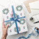Elegantens handillustrerade inslagning av papper med renmotiv och jultomter med bär, löv och eukalyptus foliage.