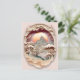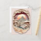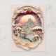 Ett vackert vykort med en framtagen papper klippscen som skildrar sol, berg, träd, gammal arkitektur.
