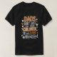 En svart t-shirt med berörande utformning med texten "Pappor inte bara Kärlek sina barn Det är en Kärlek utan ände" i vit och orange, accentuerad med små orangar. Skjortan bärs av en person som står mot en ren bakgrund.