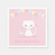 En papper napkin med ett sött, vitt kattunge som har en rosa buk bunden på svan och en krage som har en tasstrycksikon. Förutom kattungen är en liten tårta med ett ljus och en fiskad dekoration på ovansidan. Att hänga från överkanten är färgstarkt buntande flaggor för att få lite party-atmosfär. Pastel färg palett av rosa, blått, gult och vitt. Lägg till ditt födelsedagsmeddelande om du vill göra det till perfekt för en födelsedagsfest med katttemat.