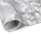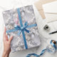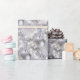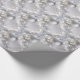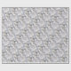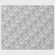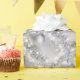 Glamorös julomslutning papper med silver julprydnad, vitt mousserande ljus och glansig finsel.
