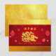 Kute papper klippning av kanin med skugga placerad på en dekorativ bakgrund med stiliserade kinesiska lyktor och blommor. Utformning av vykort för vågrät helgdag med Gott nytt år på kinesiska och År för kanin + guldtexturerad papper (utskriven bild) som bakgrund (framsida och insida). Du kan enkelt ändra kaninens, det kinesiska önskemålens och kaninens ställning och storlek (textbild). Matchande hälsningskort, inbjudan, hantverksutrustning, party och mycket snart... Perfekt för kinesiska nyåret 2023.