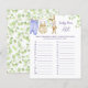 Pappra Lakan-spel "Baby Item ABC" för babydusch, babydusch, dekorerad med vackra vattenfärgade illustrationer av söta barnkläder som hänger på en linje för att torka, en söt stuffad bunny och omgiven av delikat grenar med ljust grönt löv.
