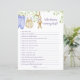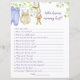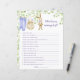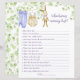 Pappra Lakan-spelet "Vem vet bäst?" för babydusch, babydusch, dekorerad med vackra vattenfärgade illustrationer av söta barnkläder som hänger på en linje för att torka, en söt stuffad bunny och omgiven av delikat grenar med ljust grönt löv.