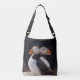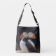 Para av puffins som tittar i motsatsriktningar på stenar på Farne öar, Northumberland. Underbart foto för en förse med text.
