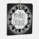 con fondo blanco y sombra negra y granos plateados rodeada con decoración negra .