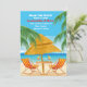 Det perfekta "save the date"-meddelandet för en strandbröllop! Designen visar en strandscen med palmer, ett stråtaket paraply, sandstolar och drinkar för två i strålande färger. Kortet är lätt att anpassa med din egen text, typsnitt, typsnittsfärg och val av sex olika papperstyper.