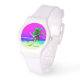 Handflatan träd på en strand i paradiset. Shock rosa med neon grönt och blått. Lila och rosa himlar med blå vatten och vit sand.
