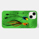 Färgfull vektorkonst av ett par fiktiva exotiska fåglar av paradiset med långa fjädrar från svan och starkt rörande på en grönt djungel som bakgrund.