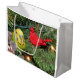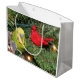 Gult- och gröntparakiter eller budgie, i en julgran som besöker med den röda huvudsakliga gåvan för helgdag för jul för prydnadfågelälskare, hänger lös. AVBILDA SKA ÄR ENDAST KORREKT PÅ DETTA, DET STORA FORMATET HÄNGER LÖS